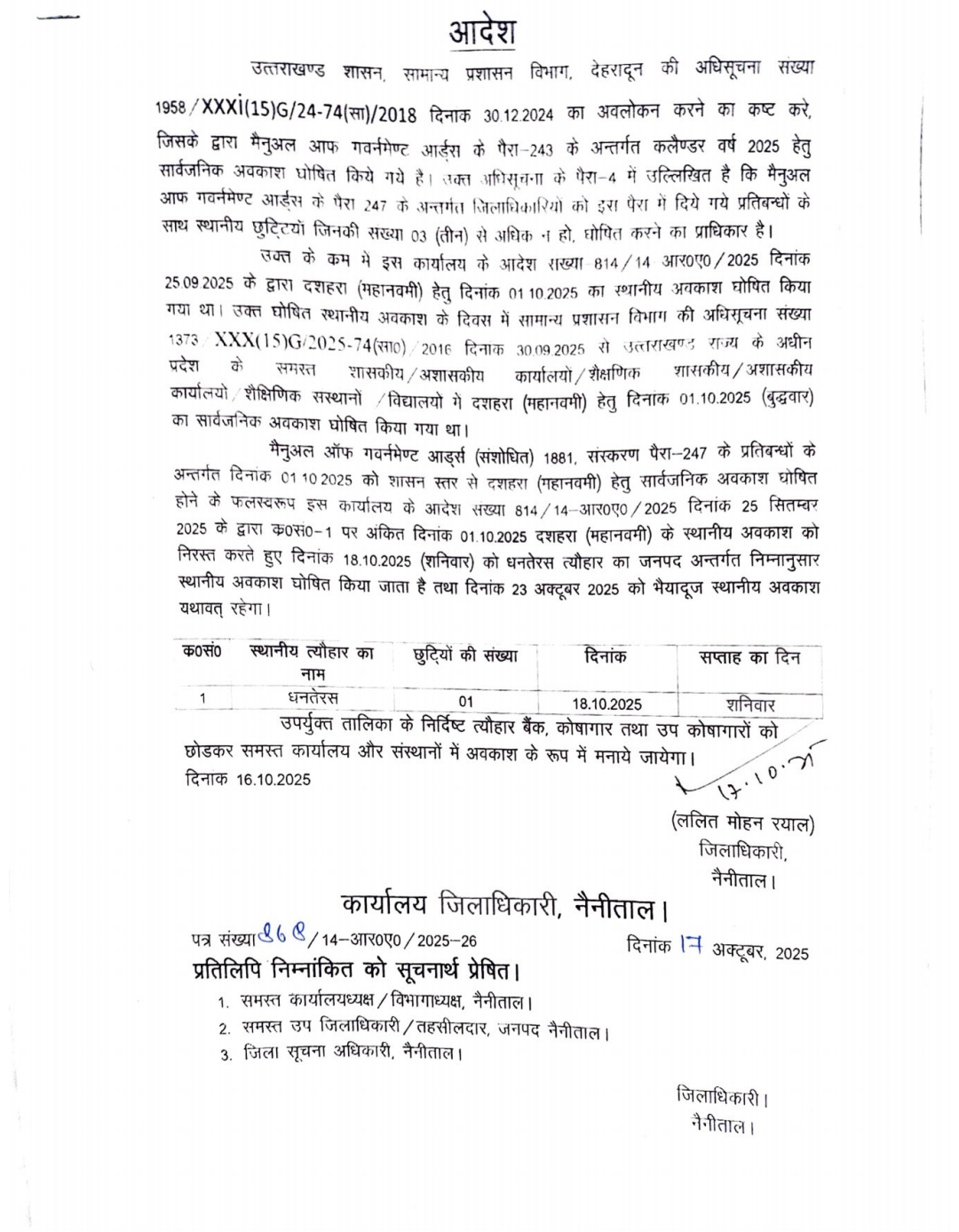 नैनीताल न्यूज़ :- जिलाधिकारी नैनीताल ललित मोहन रयाल ने जानकारी देते हुए बताया कि उत्तराखण्ड शासन, सामान्य प्रशासन विभाग, देहरादून के आदेश के अनुपालन में आगामी 18 अक्टूबर 2025 (शनिवार) को धनतेरस पर्व के अवसर पर जनपद नैनीताल के सभी शासकीय, अर्धशासकीय कार्यालयों, कोषागारों तथा उप कोषागारों में स्थानीय अवकाश घोषित किया गया है।
