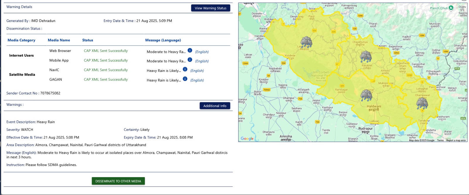 उत्तराखंड राज्य आपदा प्रबंधन प्राधिकरण द्वारा जारी चेतावनी के अनुसार दिनांक 21 अगस्त 2025 शाम 5:08 बजे से रात 8:08 बजे तक जनपद अल्मोड़ा, चंपावत, नैनीताल एवं पौड़ी गढ़वाल के विभिन्न क्षेत्रों में मध्यम से भारी वर्षा होने की संभावना है।